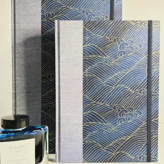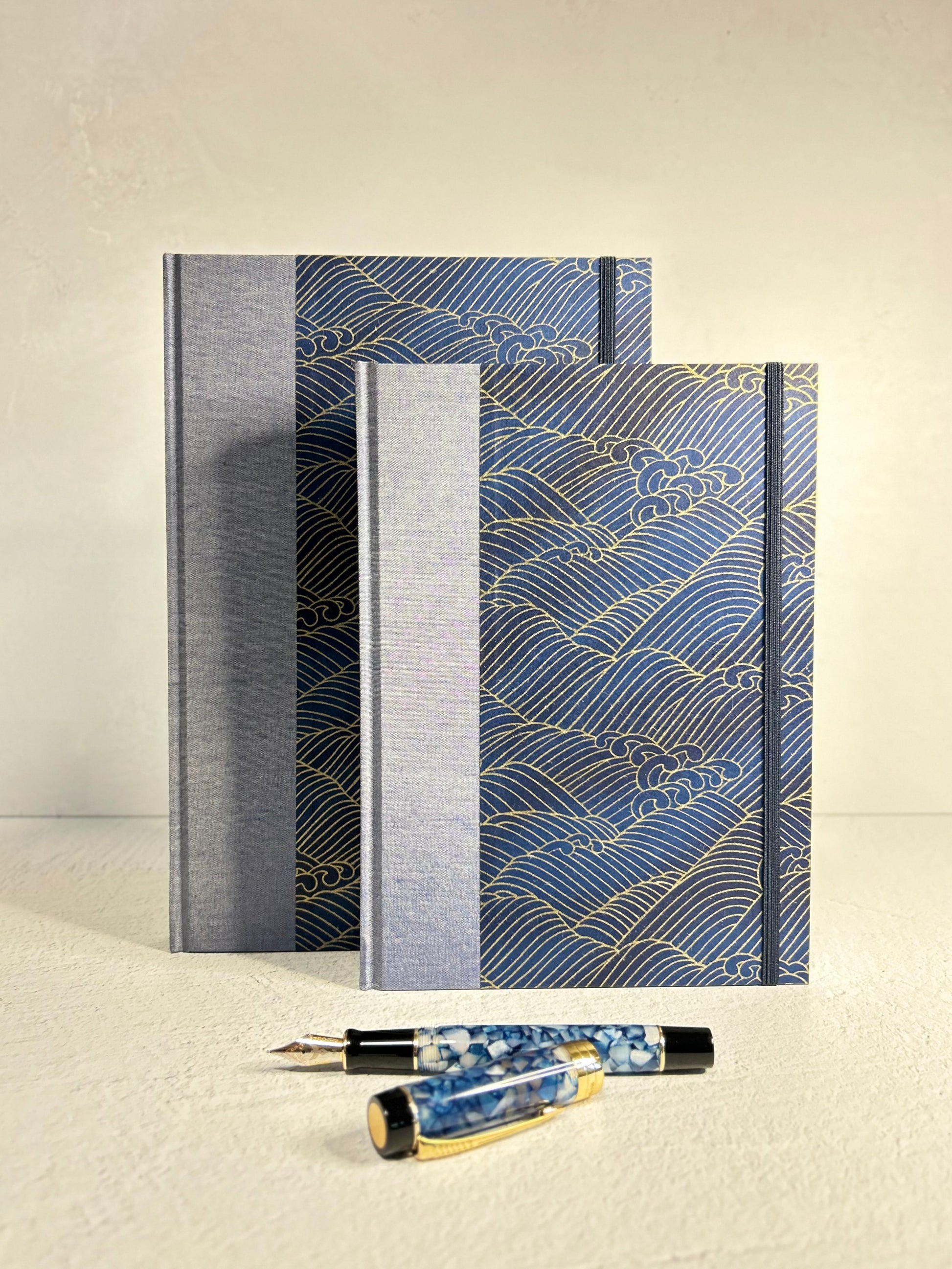 (PRE-ORDER October Delivery) A5 Hardcover Notebook finished in Golden Waves on Blue Chiyogami Paper