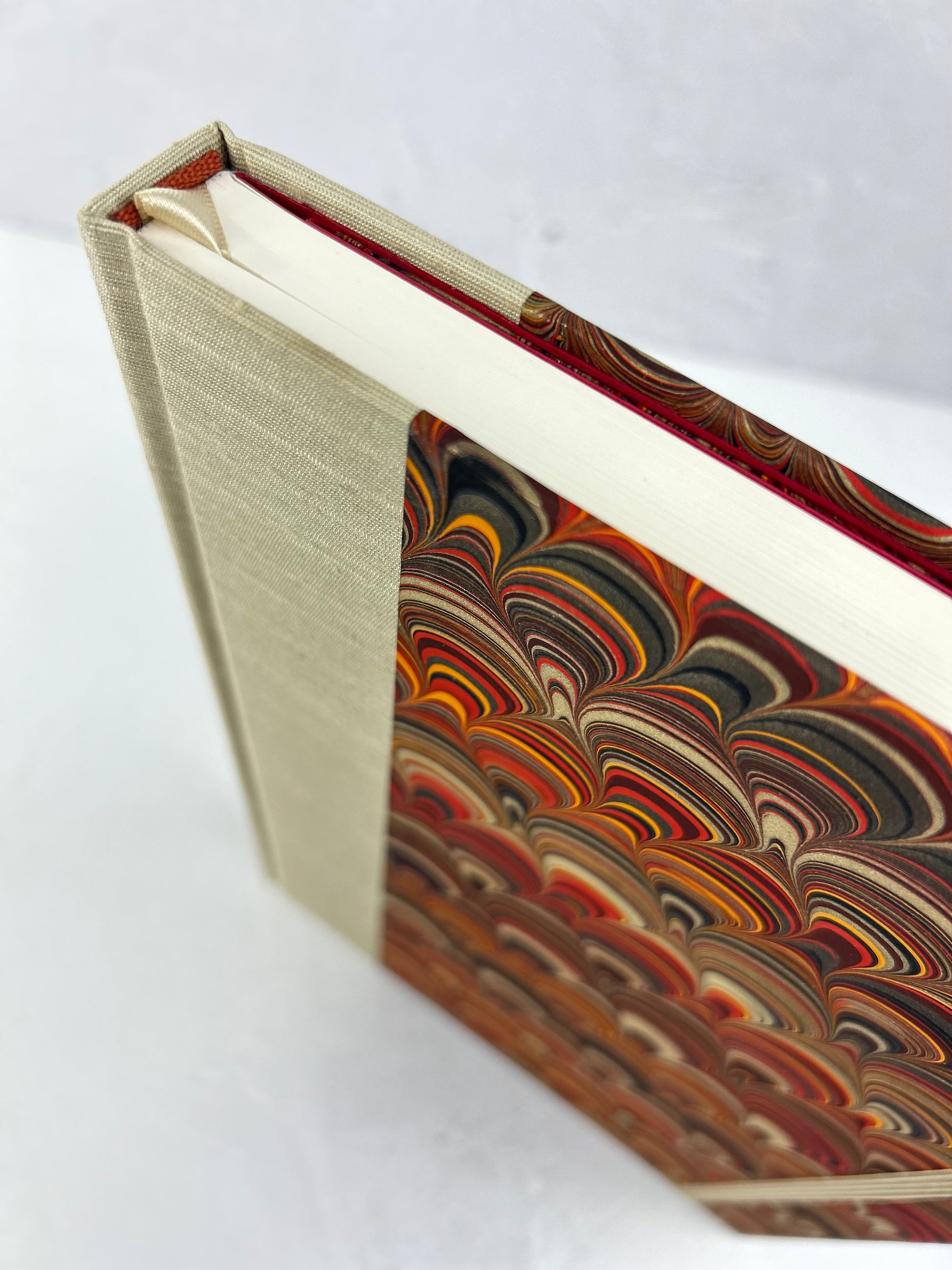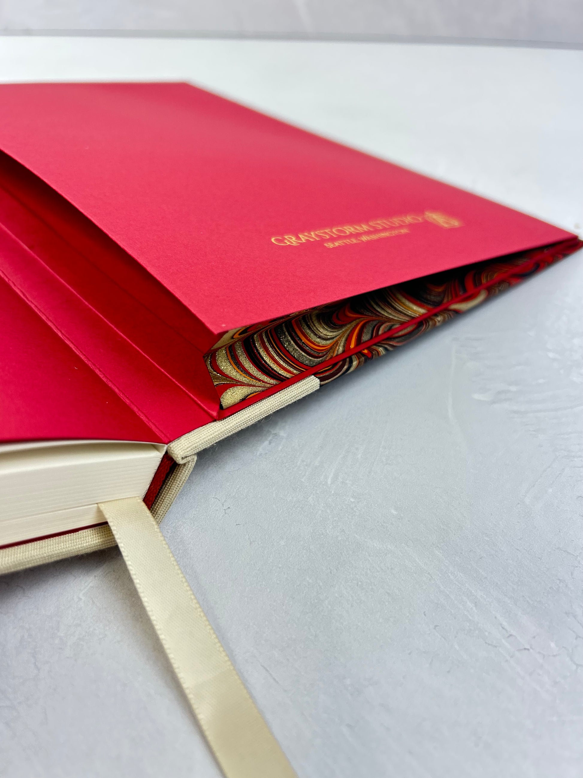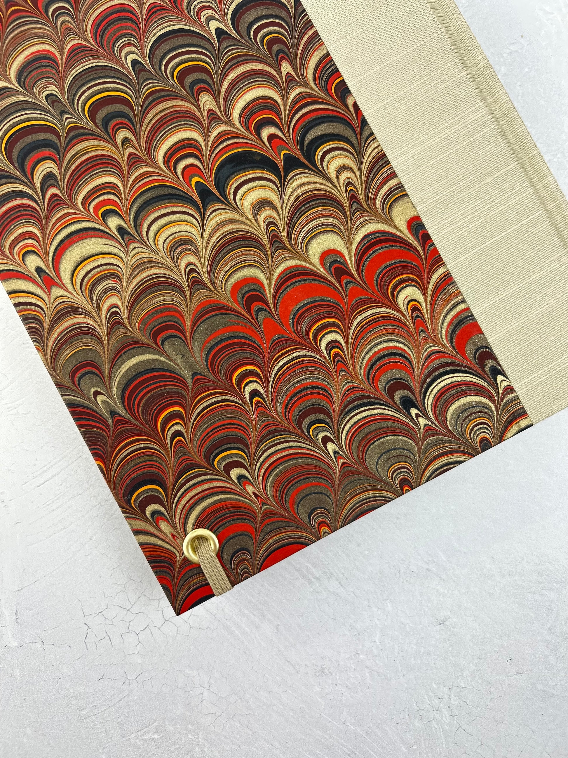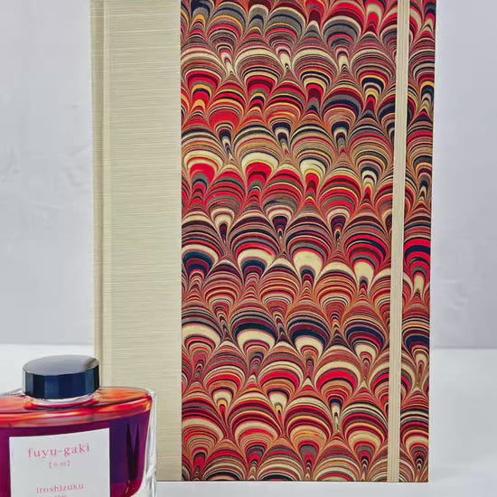 To let the marbling shine, Maddy paired it with a neutral Platinum Japanese book cloth, accented with a muted silk ribbon and elastic band. The result is understated elegance—minimalist, timeless, and absolutely unforgettable. A functional piece of art designed for everyday inspiration.