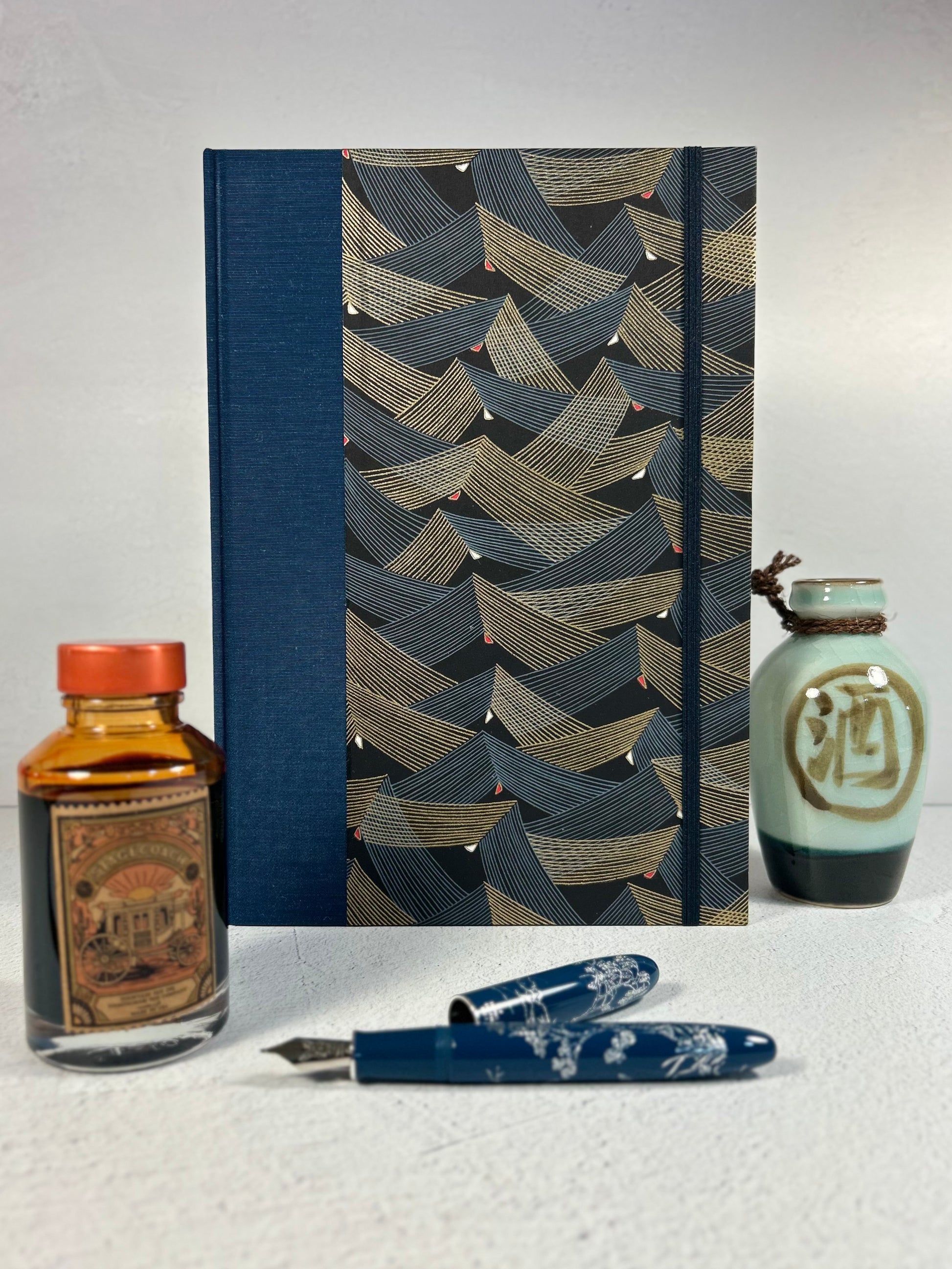 Luxurious Japanese book cloth and silkscreened Japanese Chiyogami decorative paper, is used on the hardcover casing.
