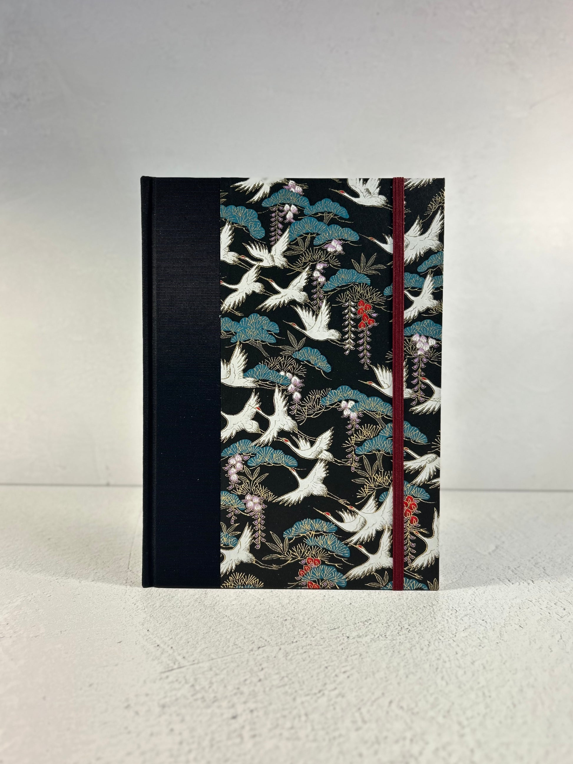 A5 Hardcover Notebook finished in White Cranes on Black Chiyogami Paper