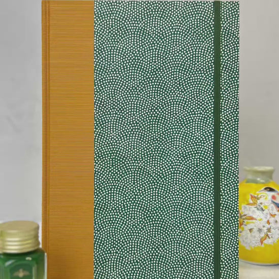 A5 Hardcover Notebook finished in White Polka Dots on Green Chiyogami Paper