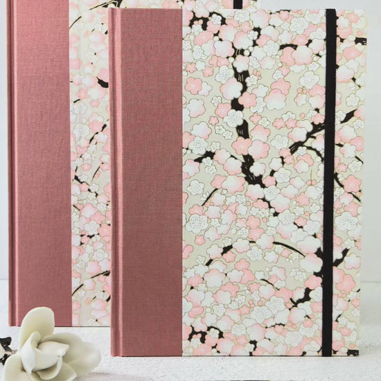 Brighten the gray days of winter with our exclusive notebooks featuring hand-printed Cherry Blossom Chiyogami. Each sheet is silk-screened by hand in small, family-run Japanese studios, with layers of color carefully aligned to create intricate, repeating patterns that capture the beauty of springtime blossoms.
