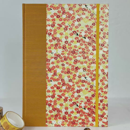 NEW A5 Hardcover Notebook finished in Ochre Japanese book cloth and Fall leaves Chiyogami Paper