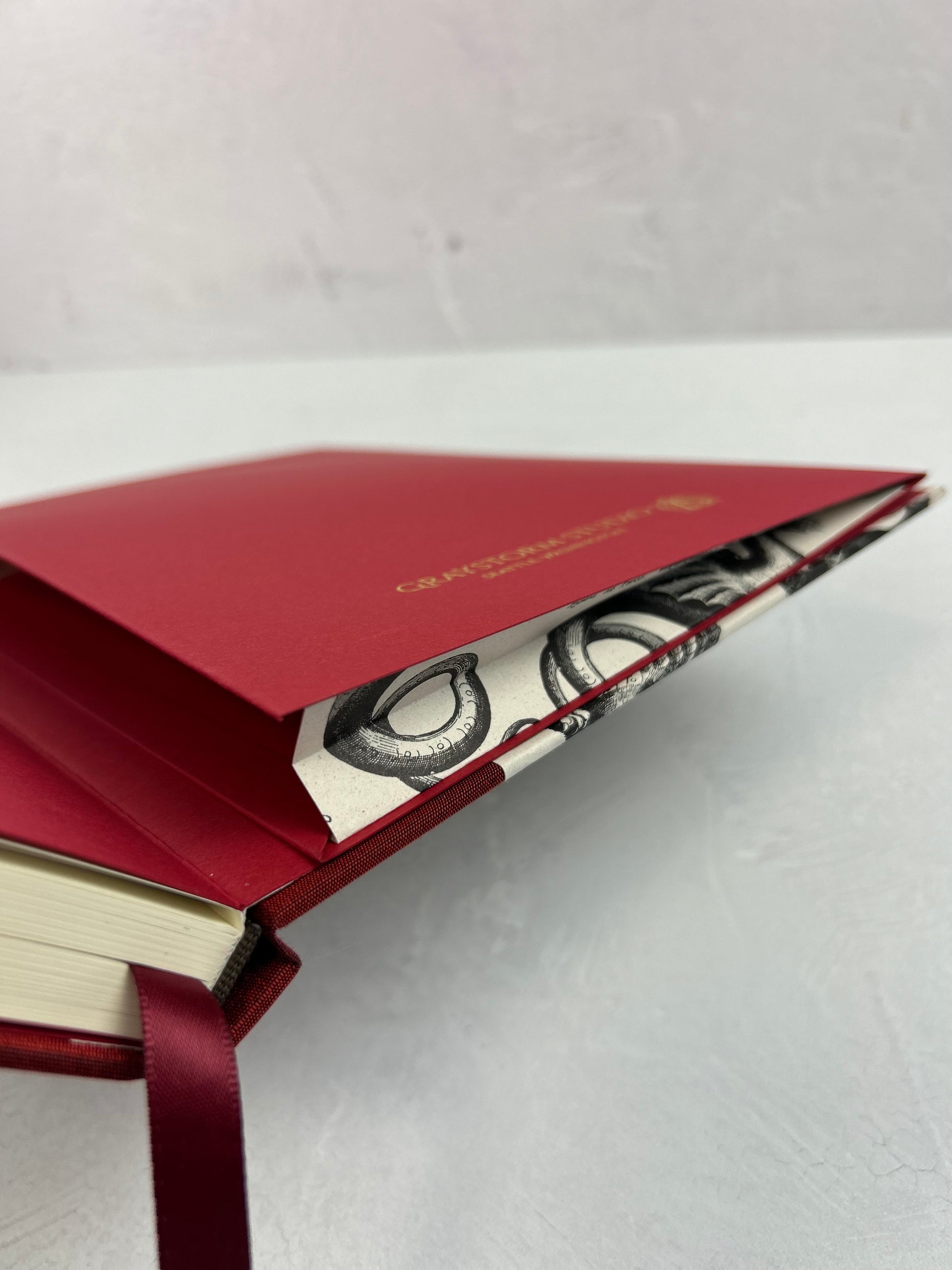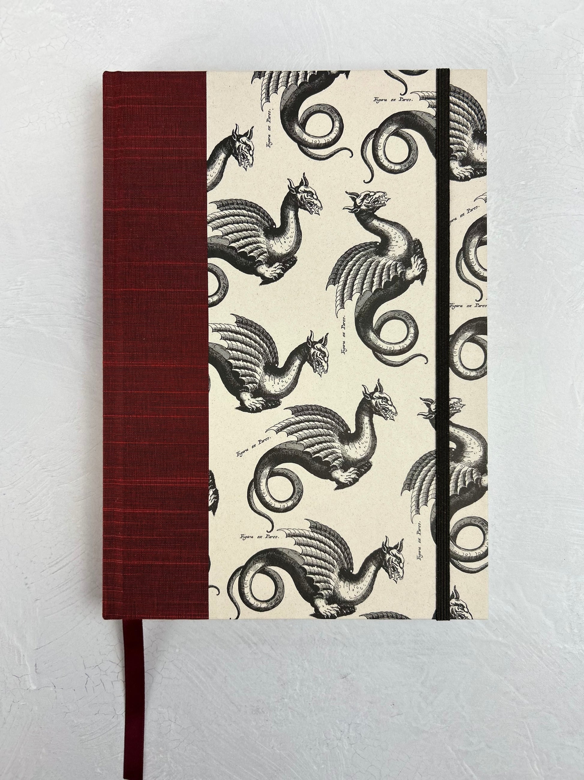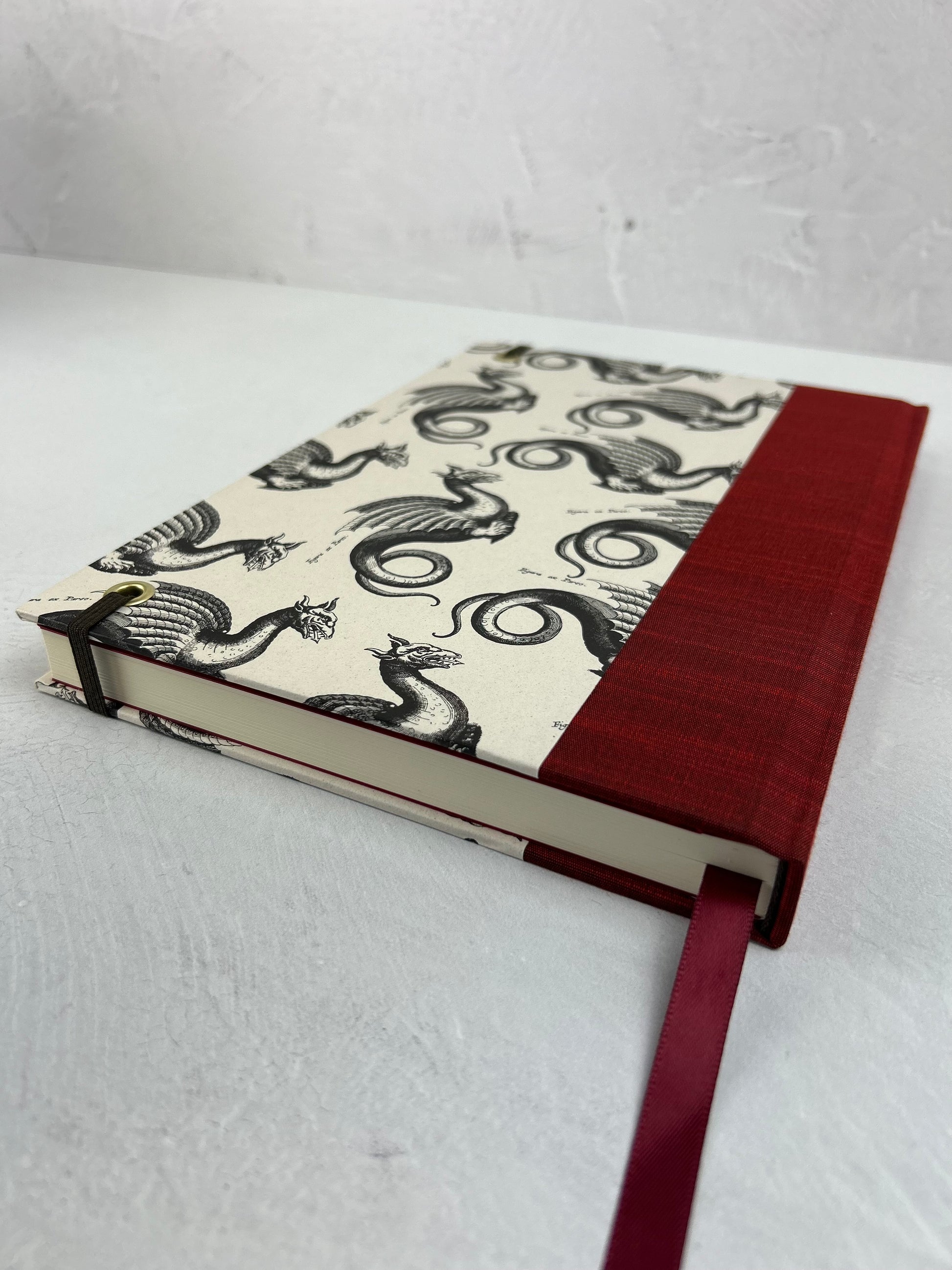 NEW A5 Hardcover Notebook finished in Blood Red Japanese book cloth and Italian Medieval Letterpress Dragons Paper