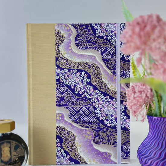 A5 Hardcover Notebook finished in Soft Gold Japanese book cloth and Imperial Purple and Gold Chiyogami