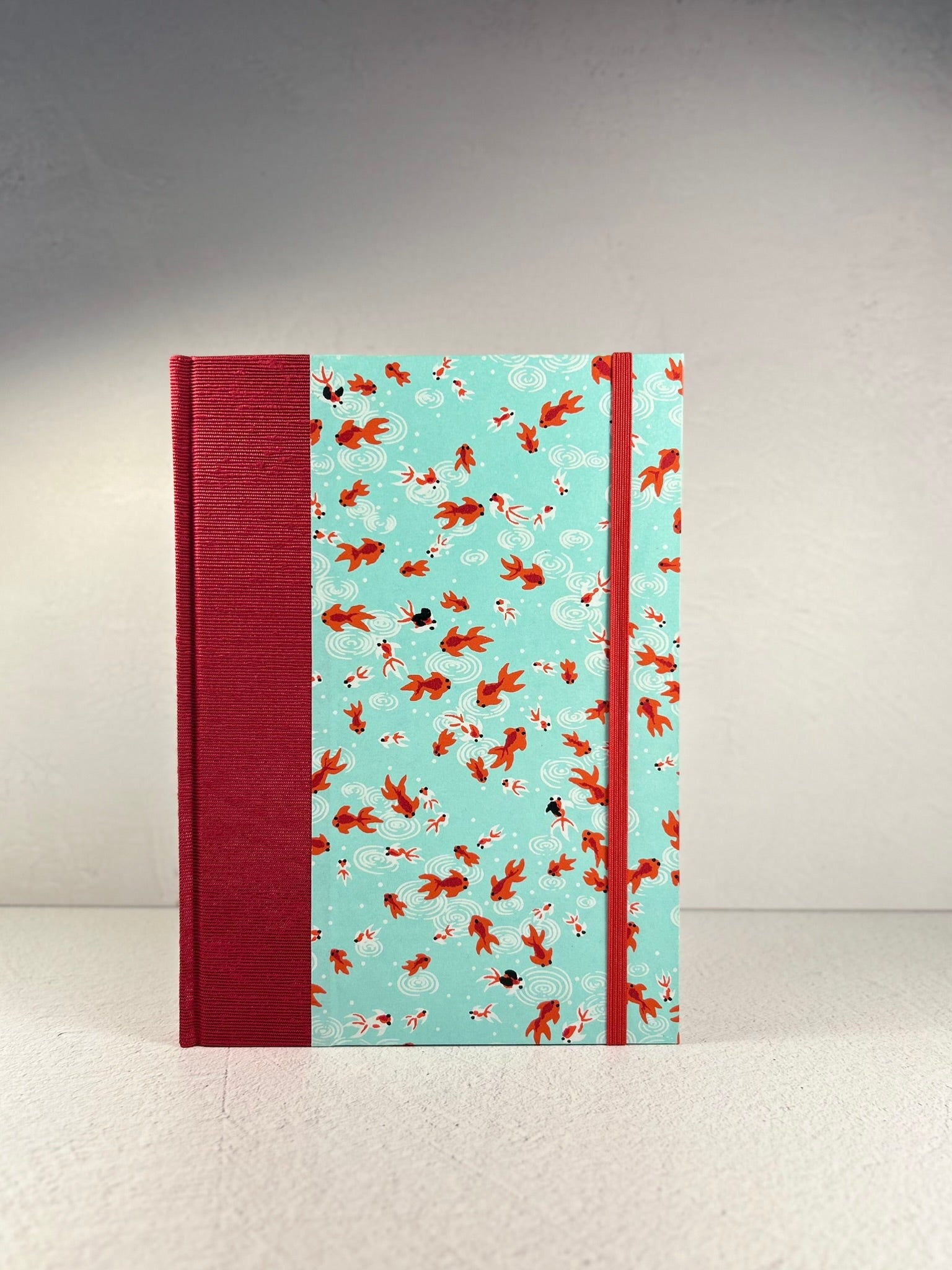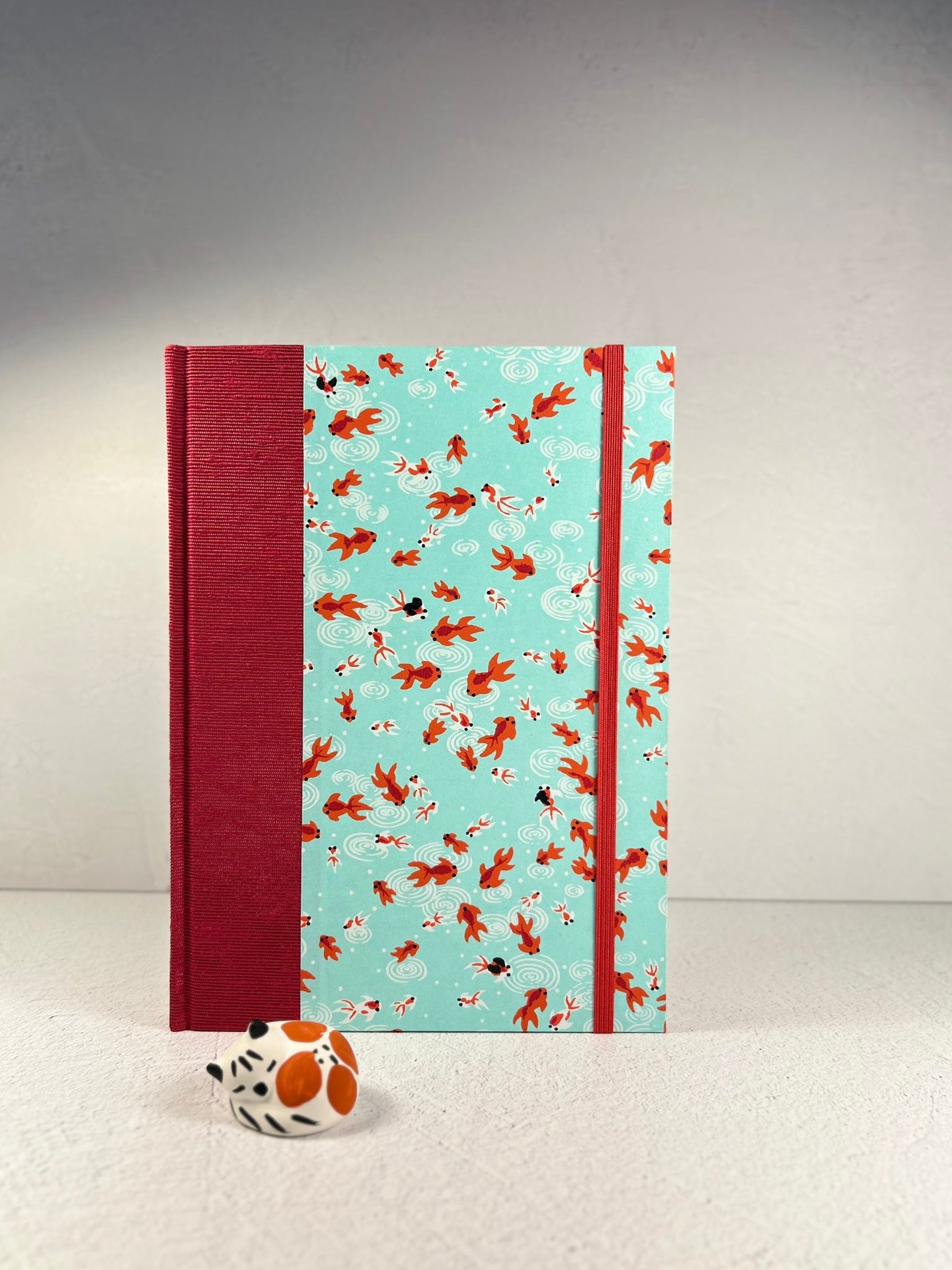 A5 Hardcover Notebook finished in Scarlet Red Japanese Bookcloth and Red/Orange Koi Fish on Aqua Chiyogami Paper