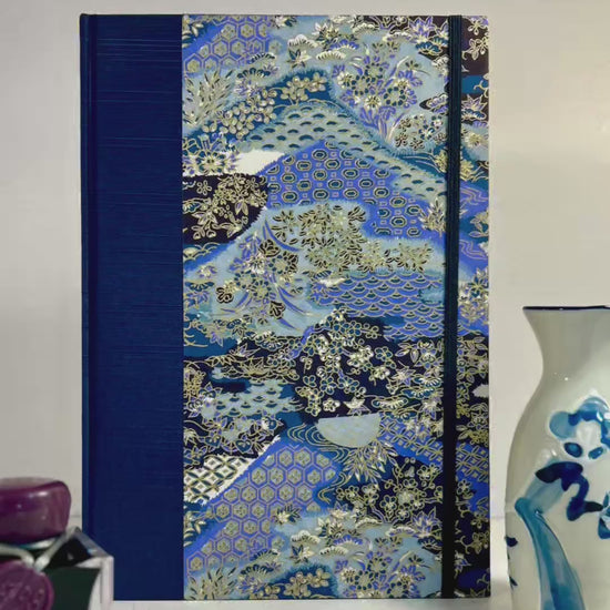 This latest release pairs a refined Cadet Blue Japanese book cloth with a rare Vintage Chiyogami decorative paper in deep blue and violet tones.