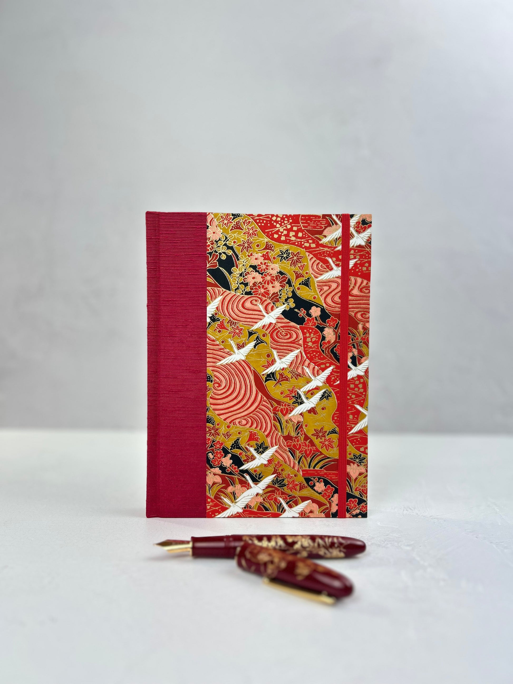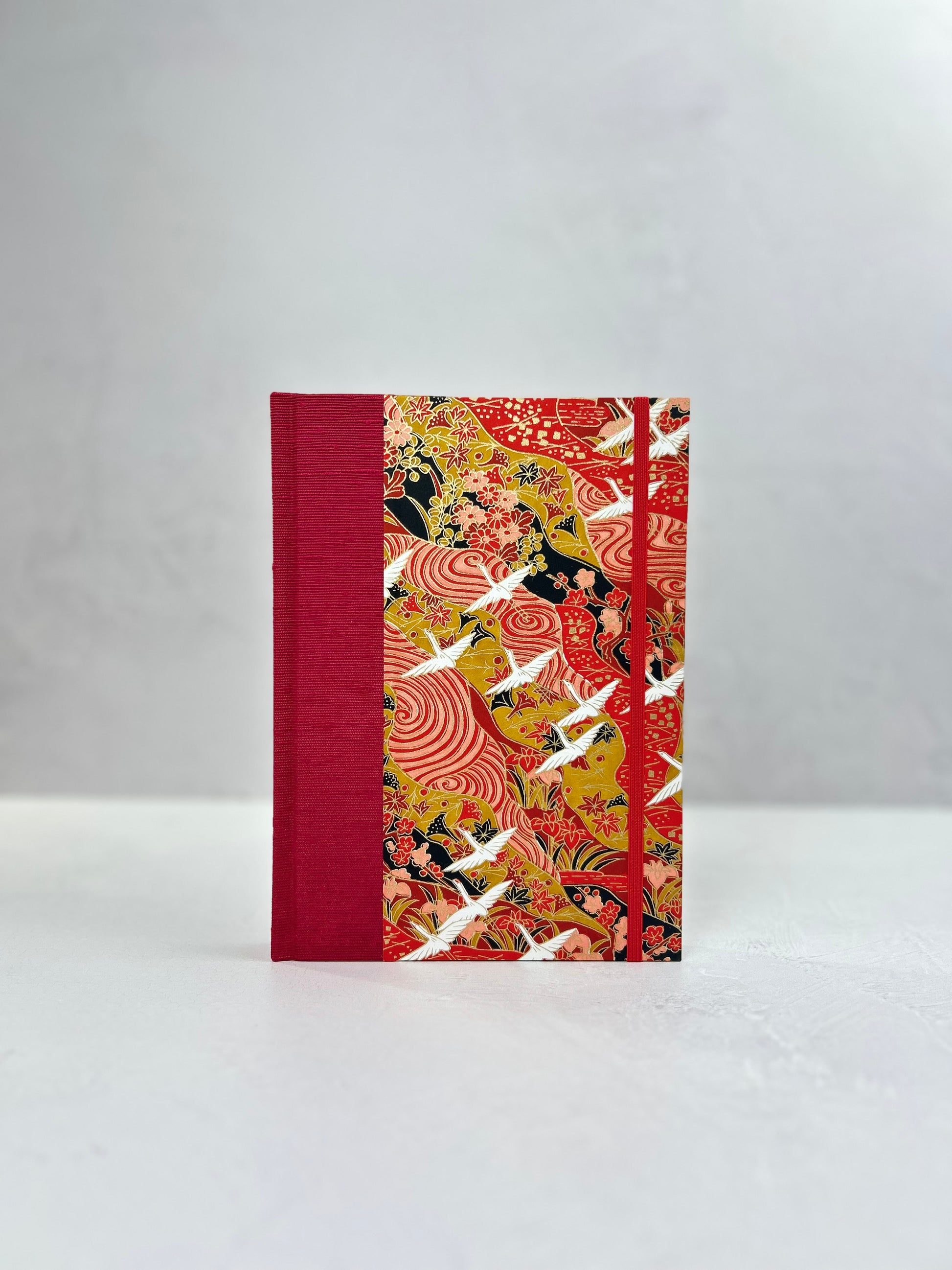 A5 Hardcover Notebook finished in Cardinal Red Japanese book cloth and White Cranes on Red Chiyogami Paper