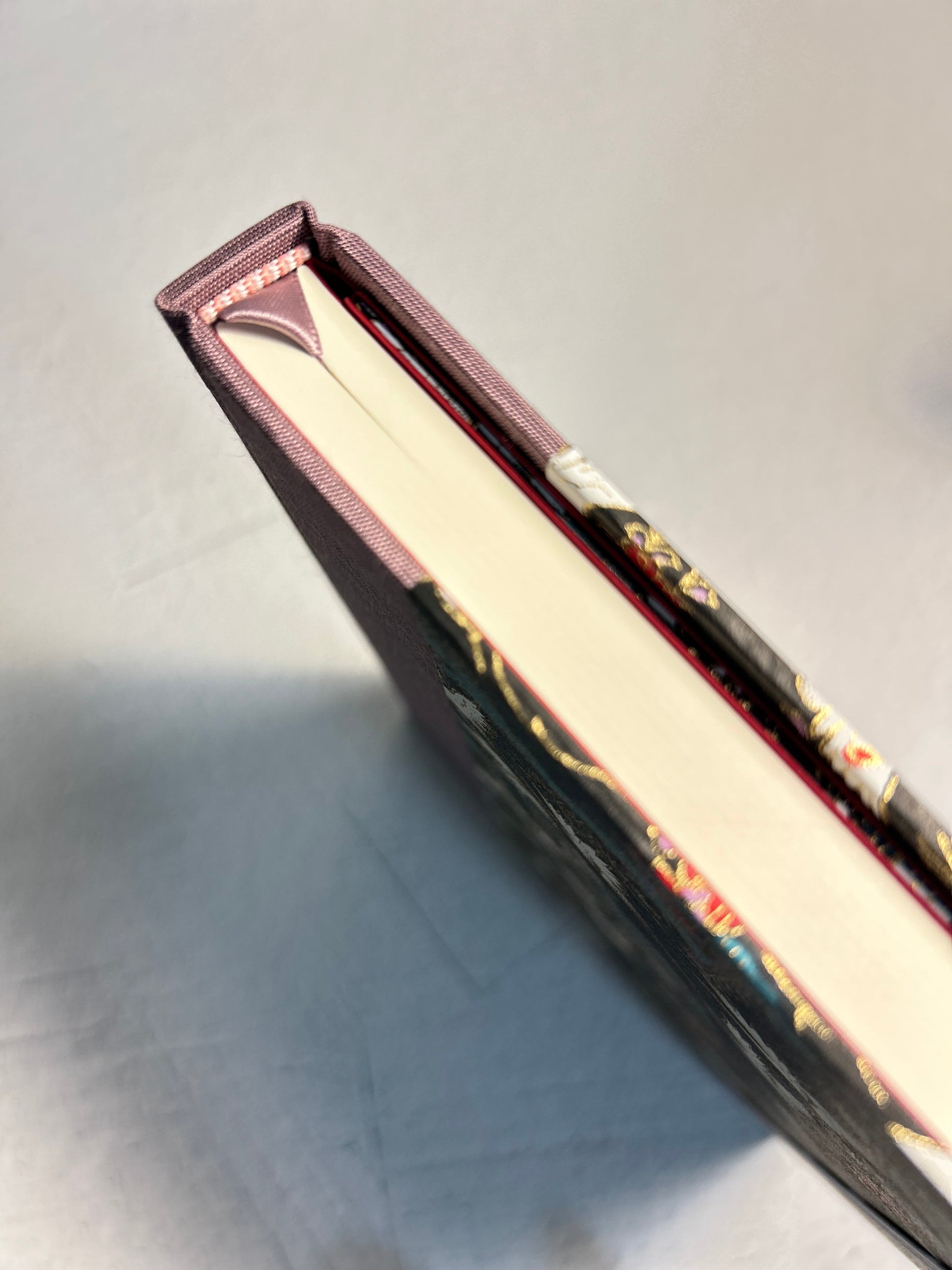 The quality craftsmanship is evident in thoughtful additions like a back pocket adorned with decorative paper, an elastic band for secure closure, and a silky ribbon placeholder to keep your place.