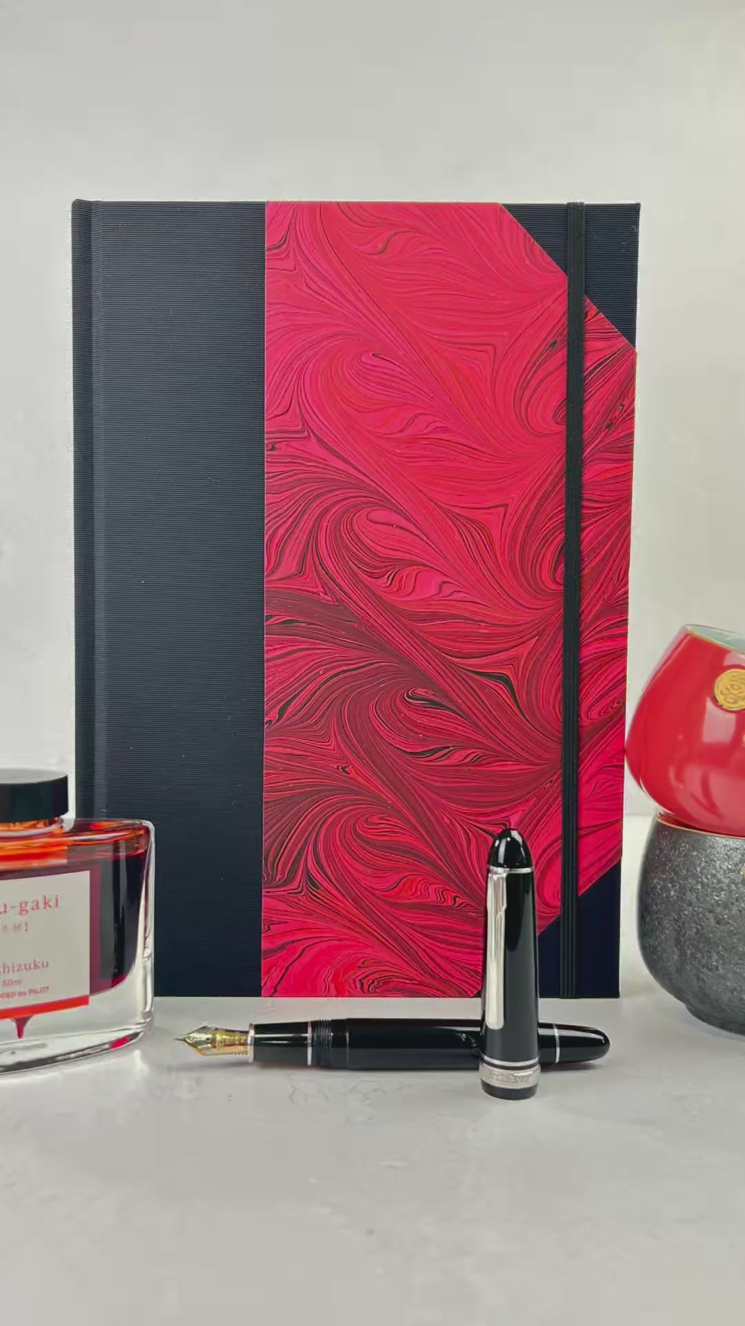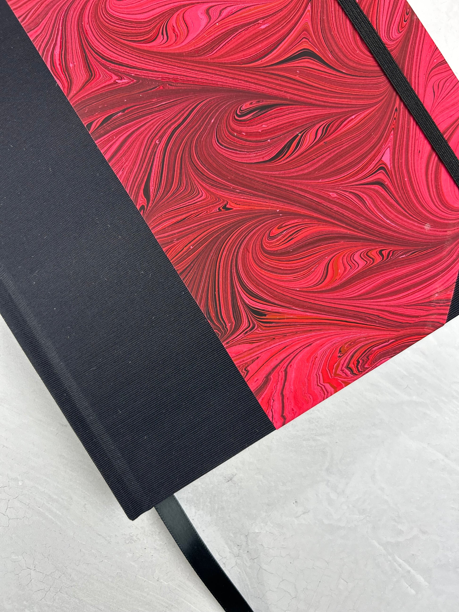 B5 192-page Hardcover Journal finished in Black Japanese book cloth and red hand marbled paper by Daniel Gaál
