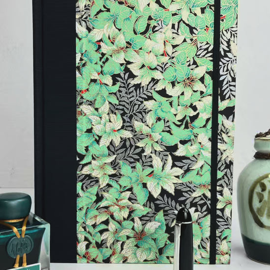 B5 192-page Hardcover Journal finished in black Japanese book cloth with green and silver botanical Chiyogami Paper