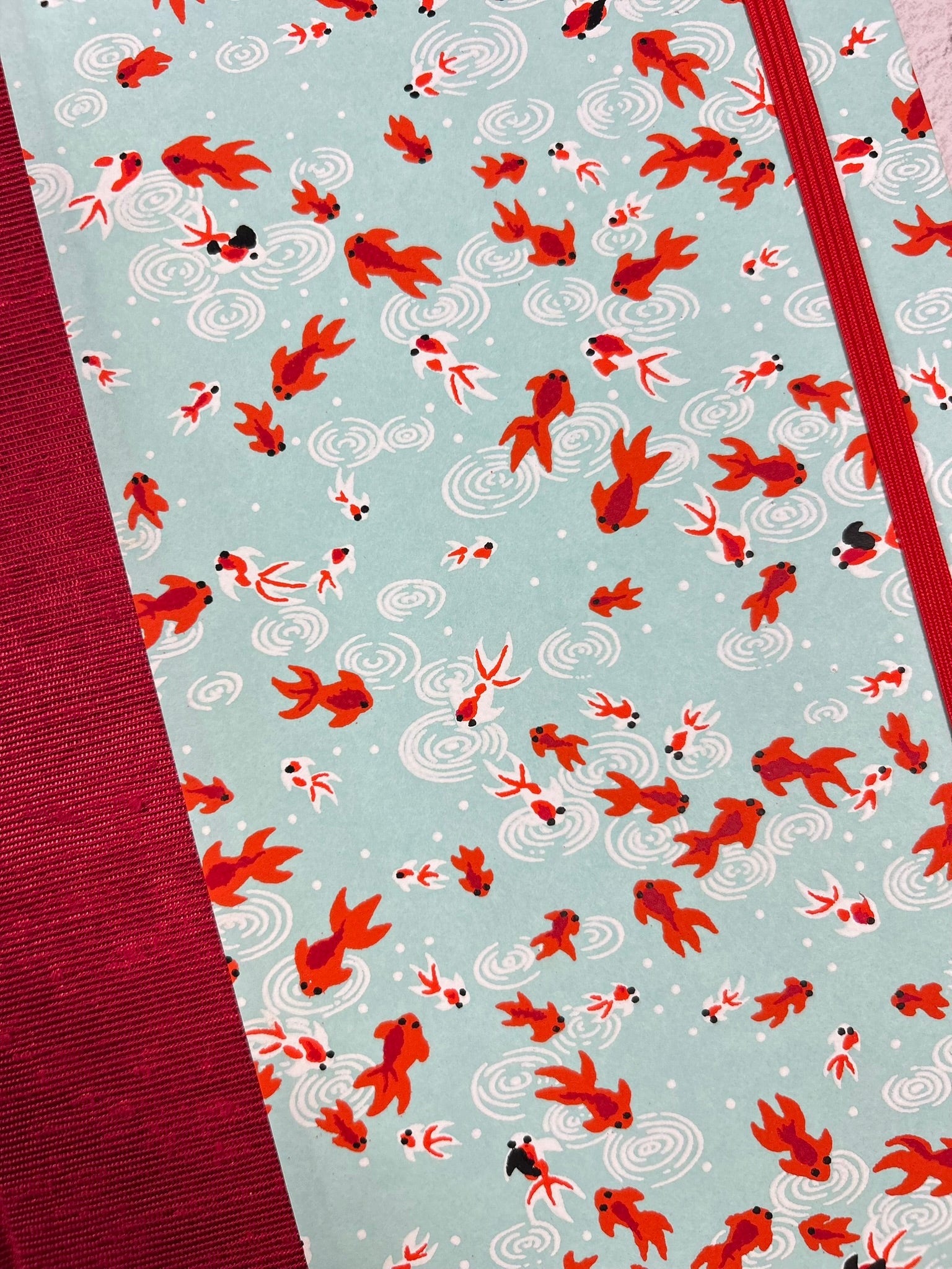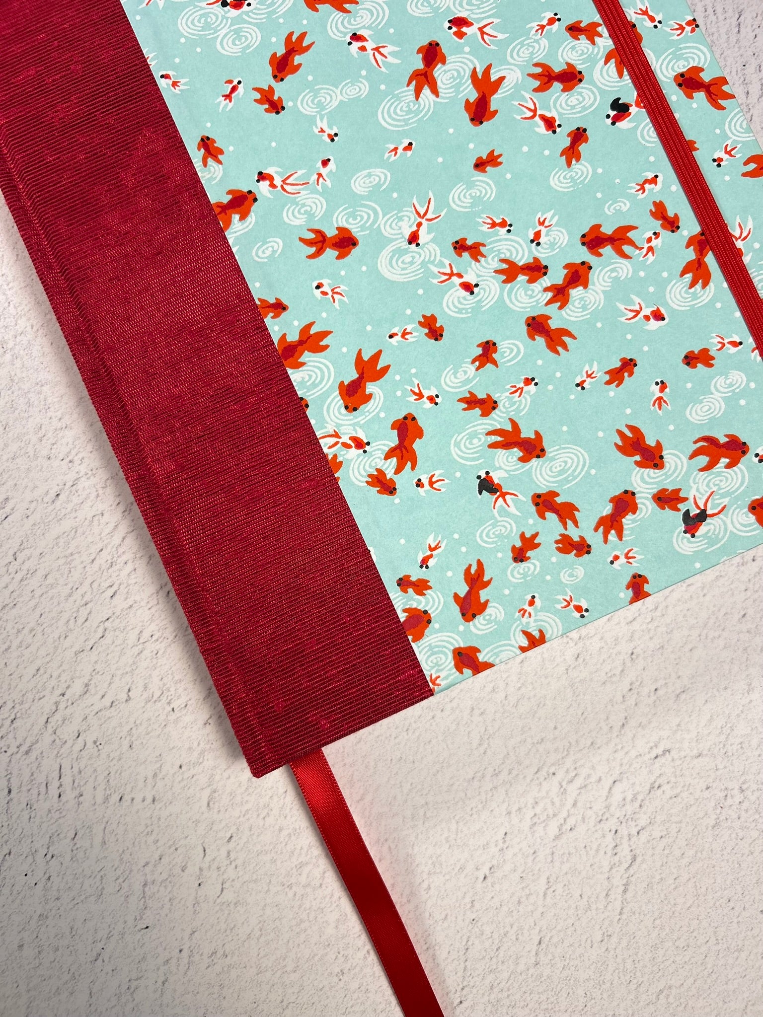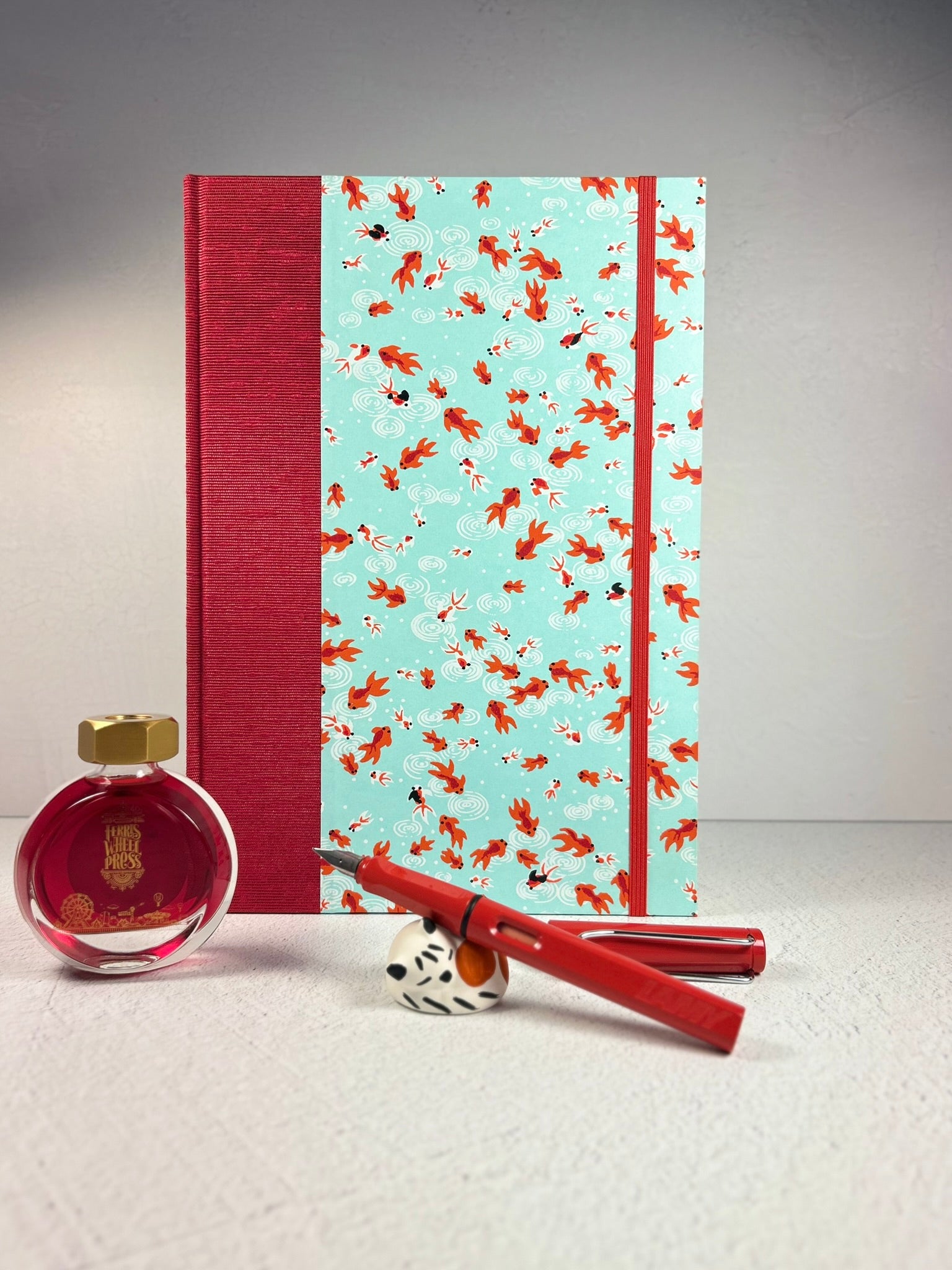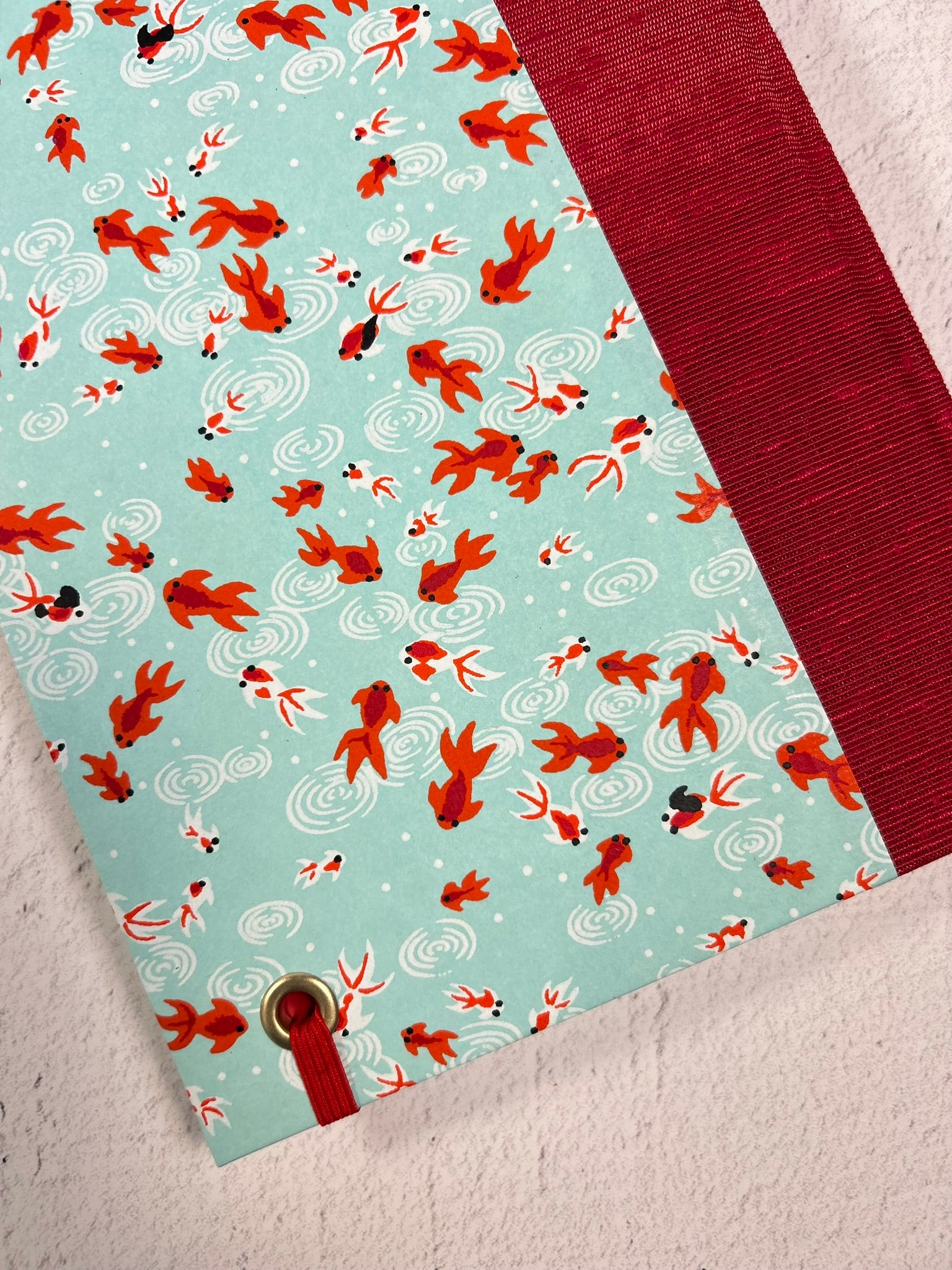 B5 Hardcover Notebook finished in Scarlet Red Japanese Bookcloth and Red/Orange Koi Fish on Aqua Chiyogami Paper