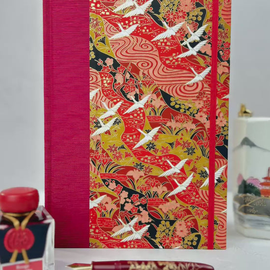 NEW B5 Hardcover Notebook finished in Cardinal Red Japanese book cloth and White Cranes on Red Chiyogami Paper