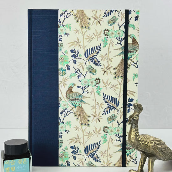 Our Peacock Collection pays tribute to this remarkable creature through an exquisitely detailed Italian print, rendered in rich shades of blue, turquoise, gold, and bronze. Each notebook is carefully paired with a Cadette Blue Japanese book cloth, chosen to complement the deep blue accents of the design and enhance the intricate artistry of the paper.
