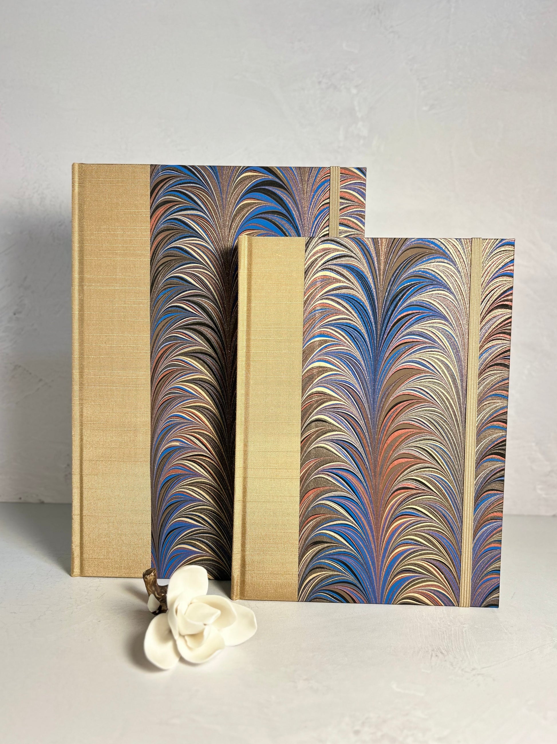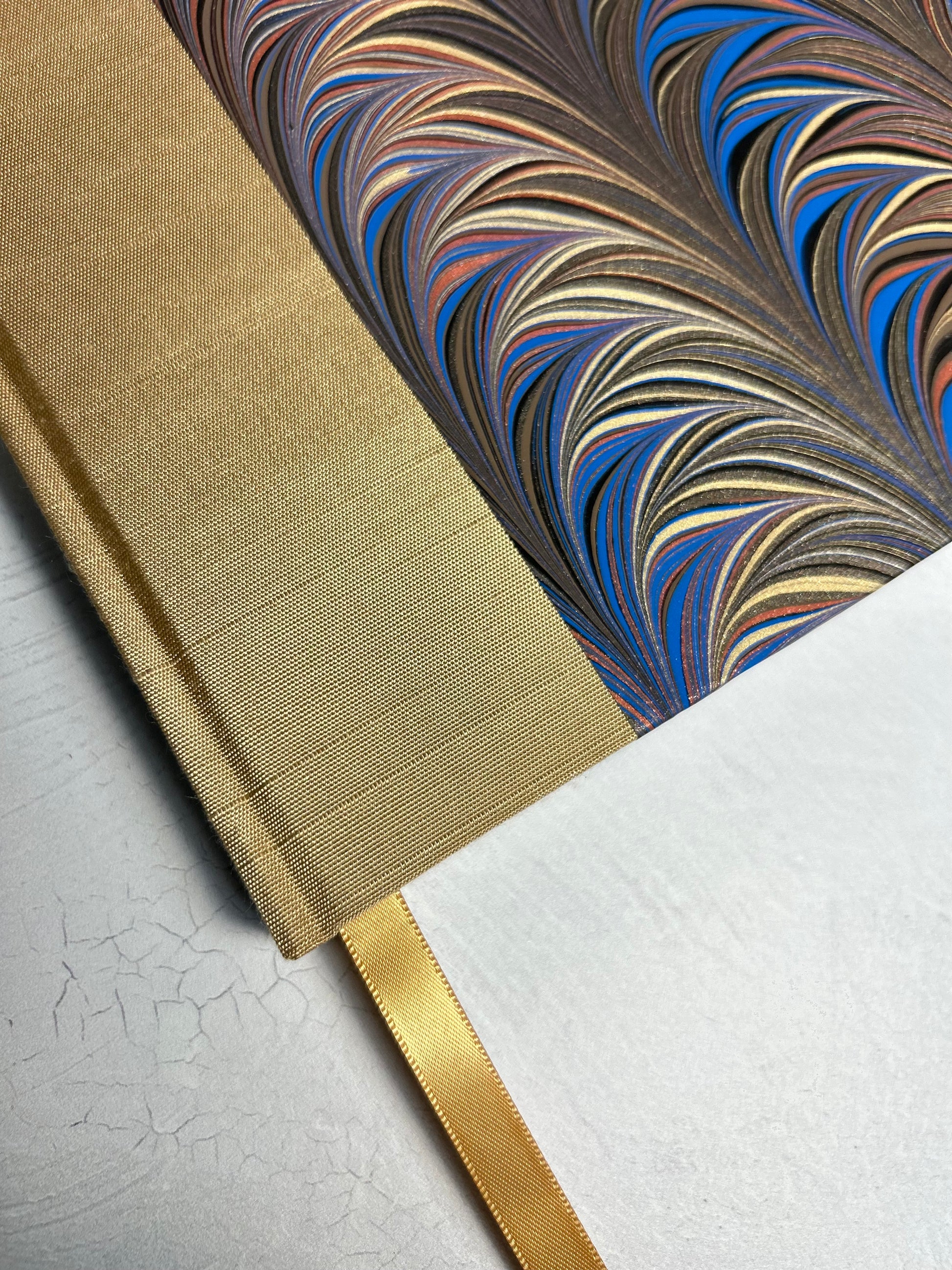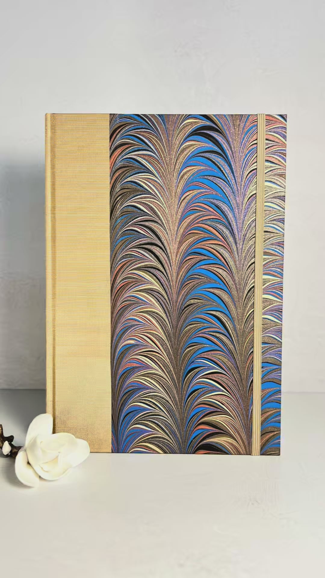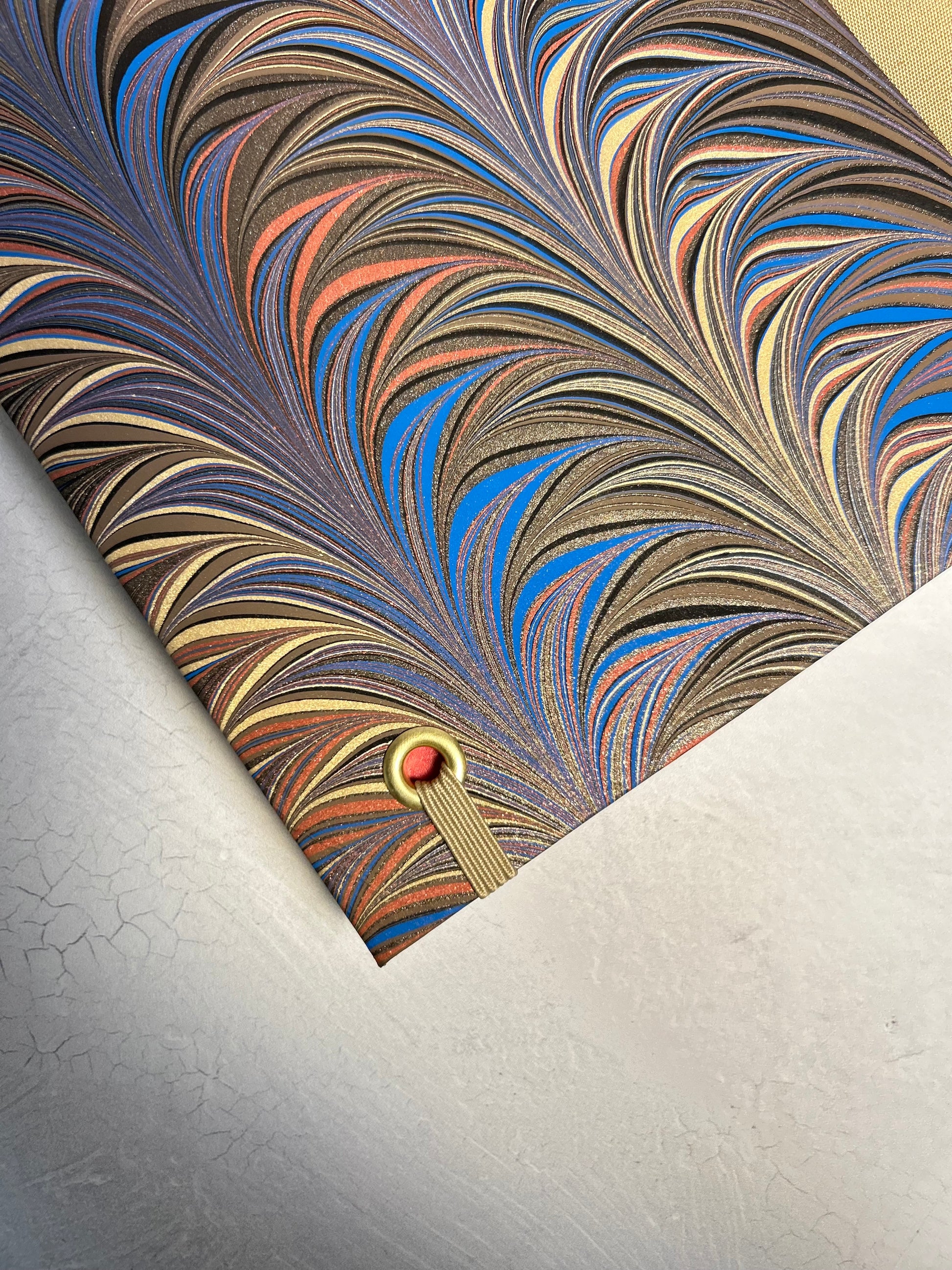 For this release, I’ve paired the Blue & Brown Fern marbled paper with a soft gold Japanese book cloth. A muted khaki elastic band complements the palette without distraction, allowing the shimmering gold details and vibrant marbling to take center stage.
