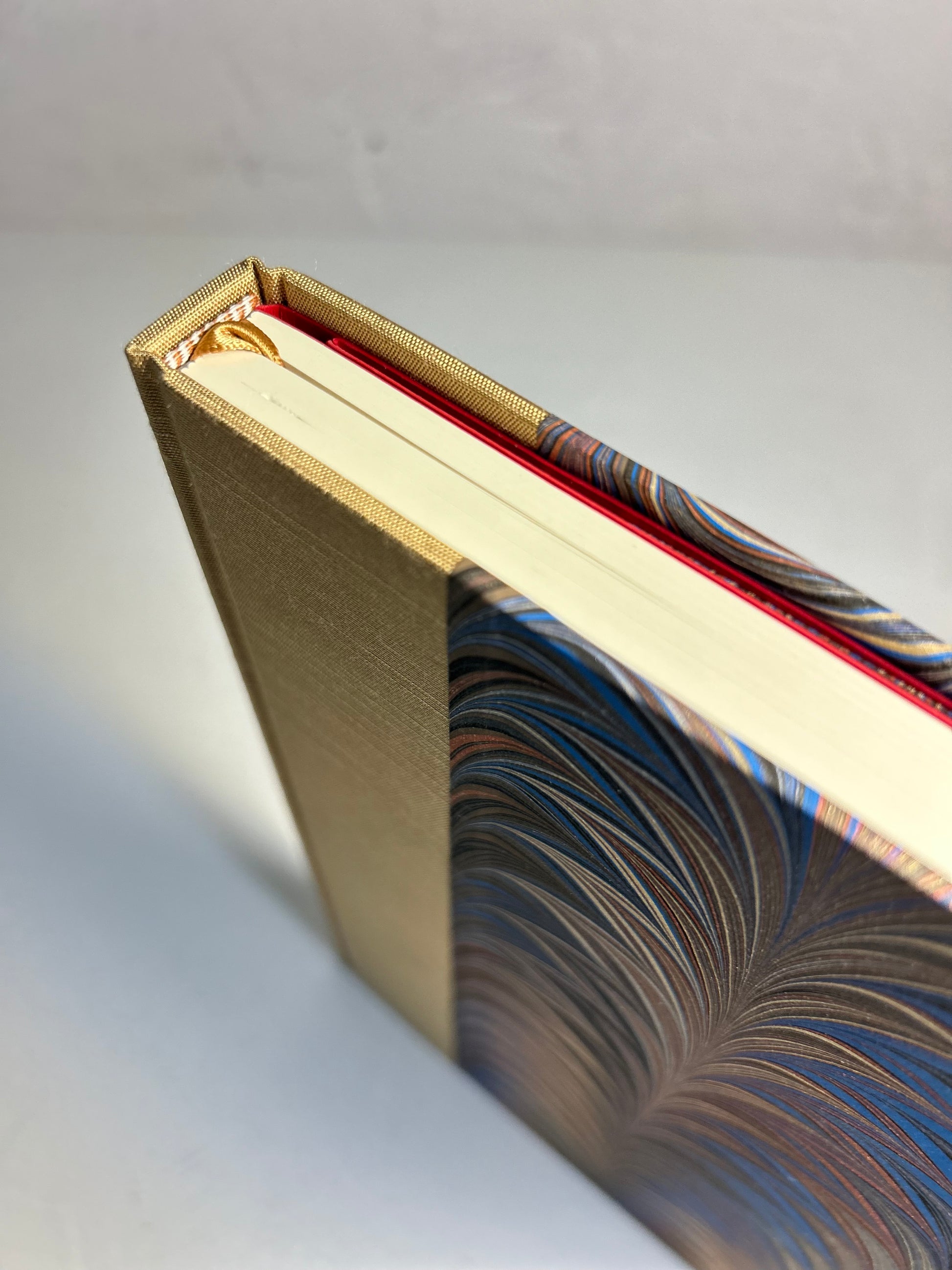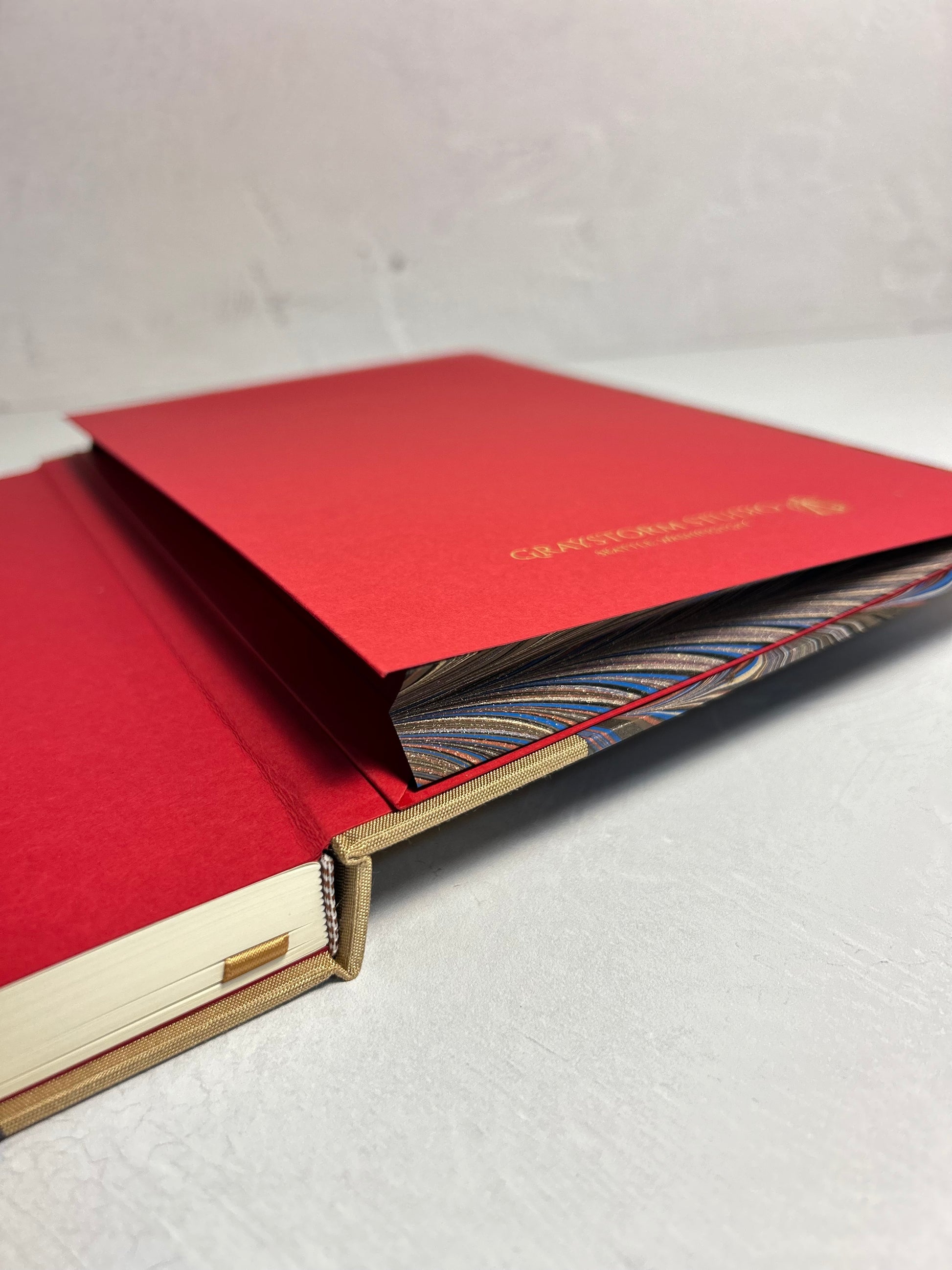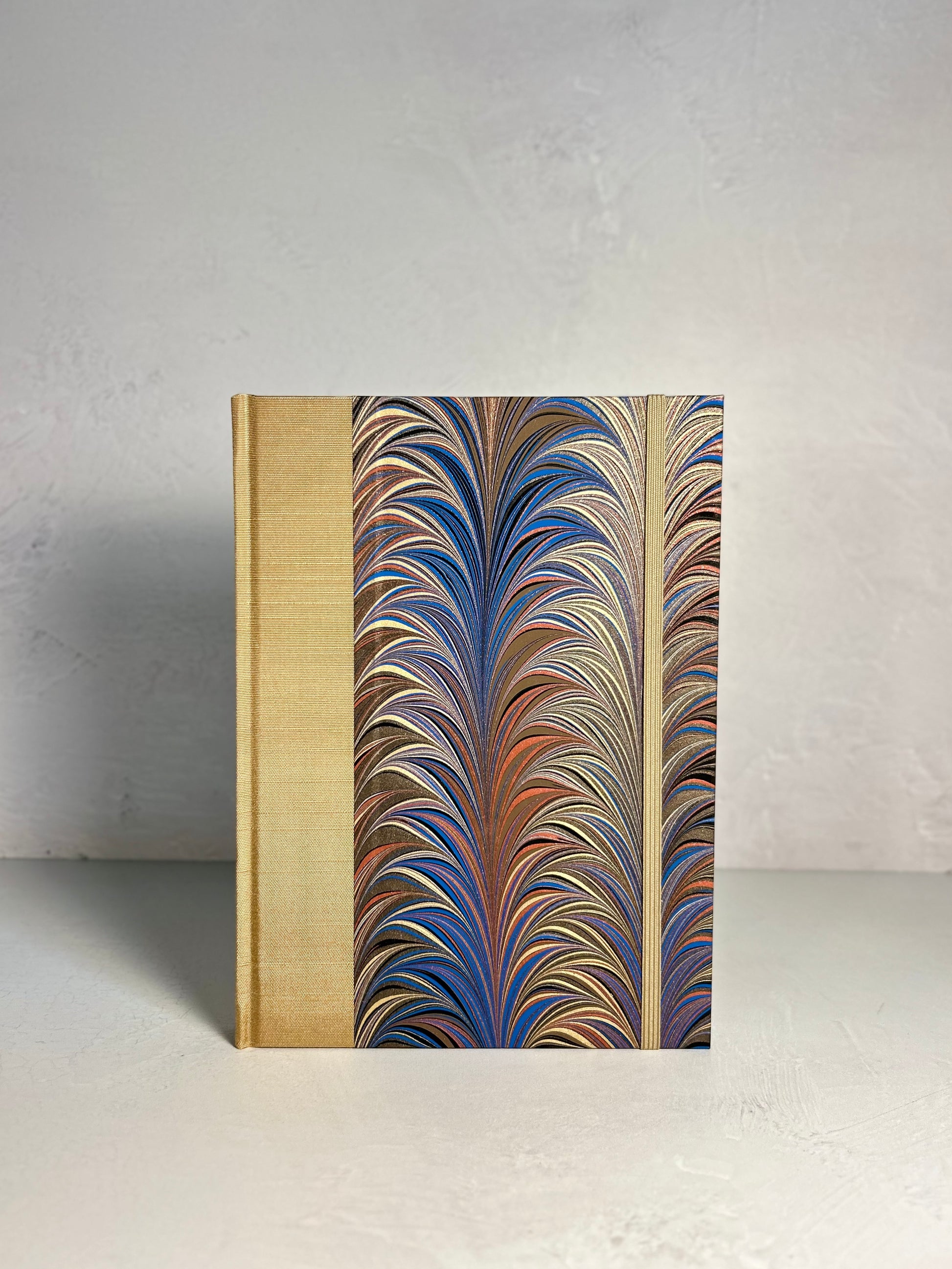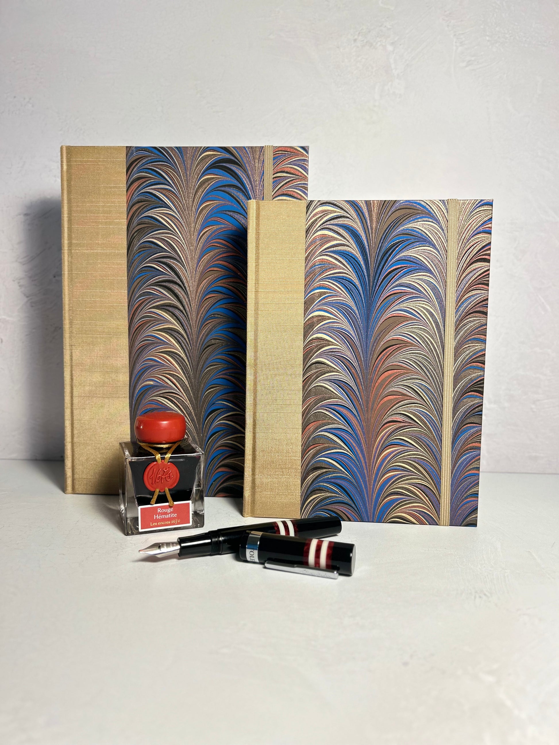 For this release, I’ve paired the Blue & Brown Fern marbled paper with a soft gold Japanese book cloth. A muted khaki elastic band complements the palette without distraction, allowing the shimmering gold details and vibrant marbling to take center stage.