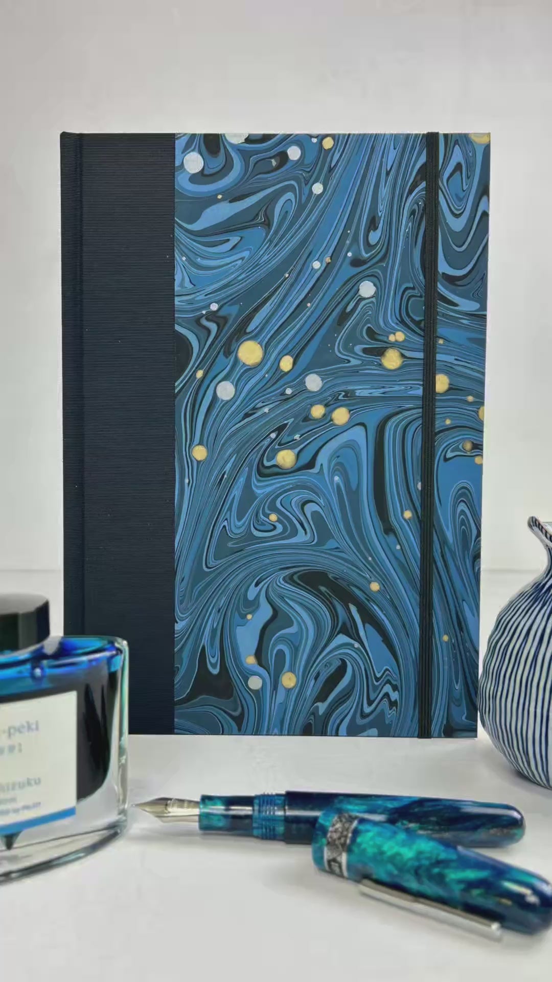Luxurious Japanese book cloth combined with hand marbled Renato Crepaldi decorative paper, is used on the hardcover casing.