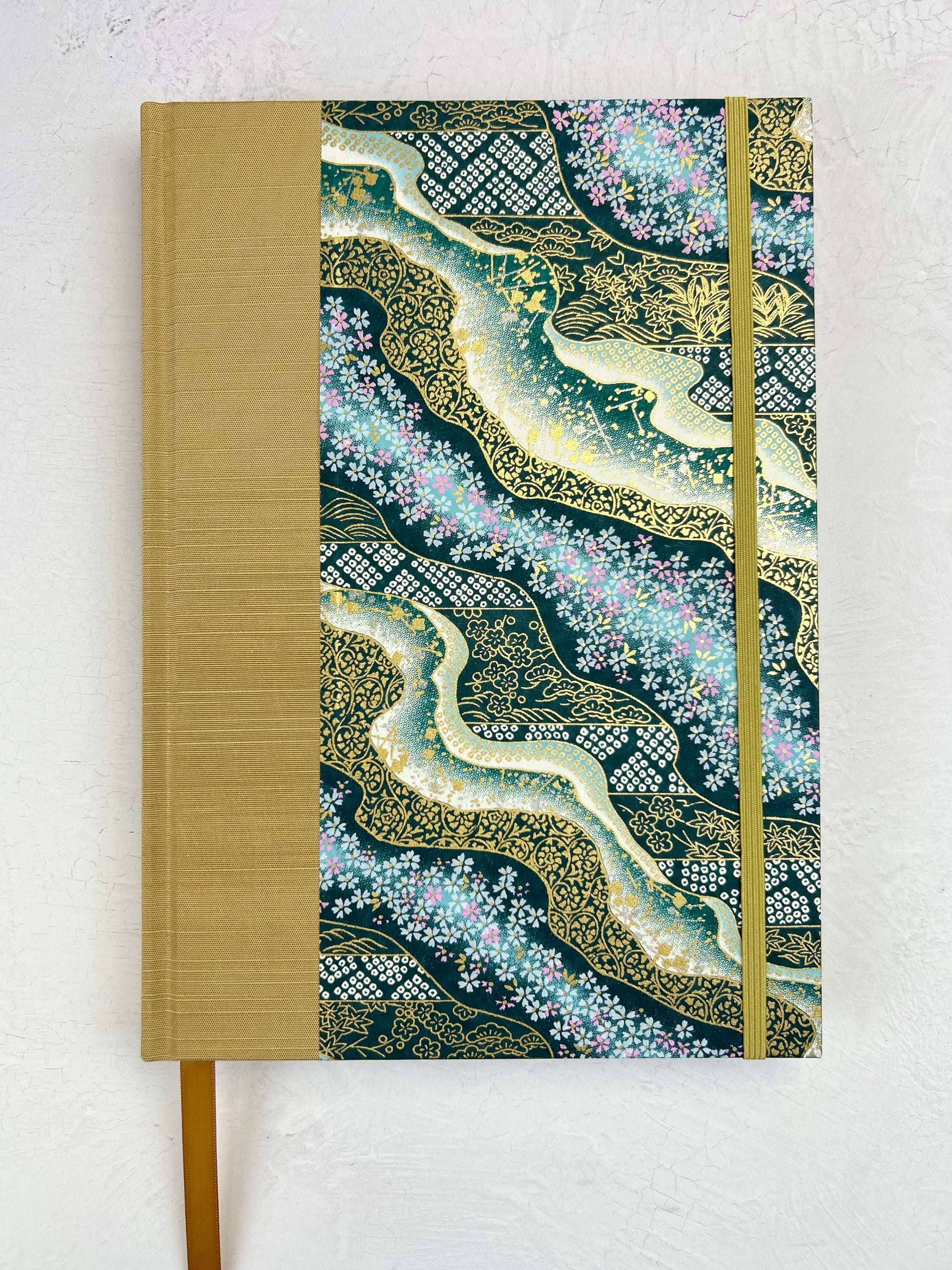 A5 160-page Hardcover Journal finished in Soft Gold Japanese book cloth and Floral Chiyogami Paper