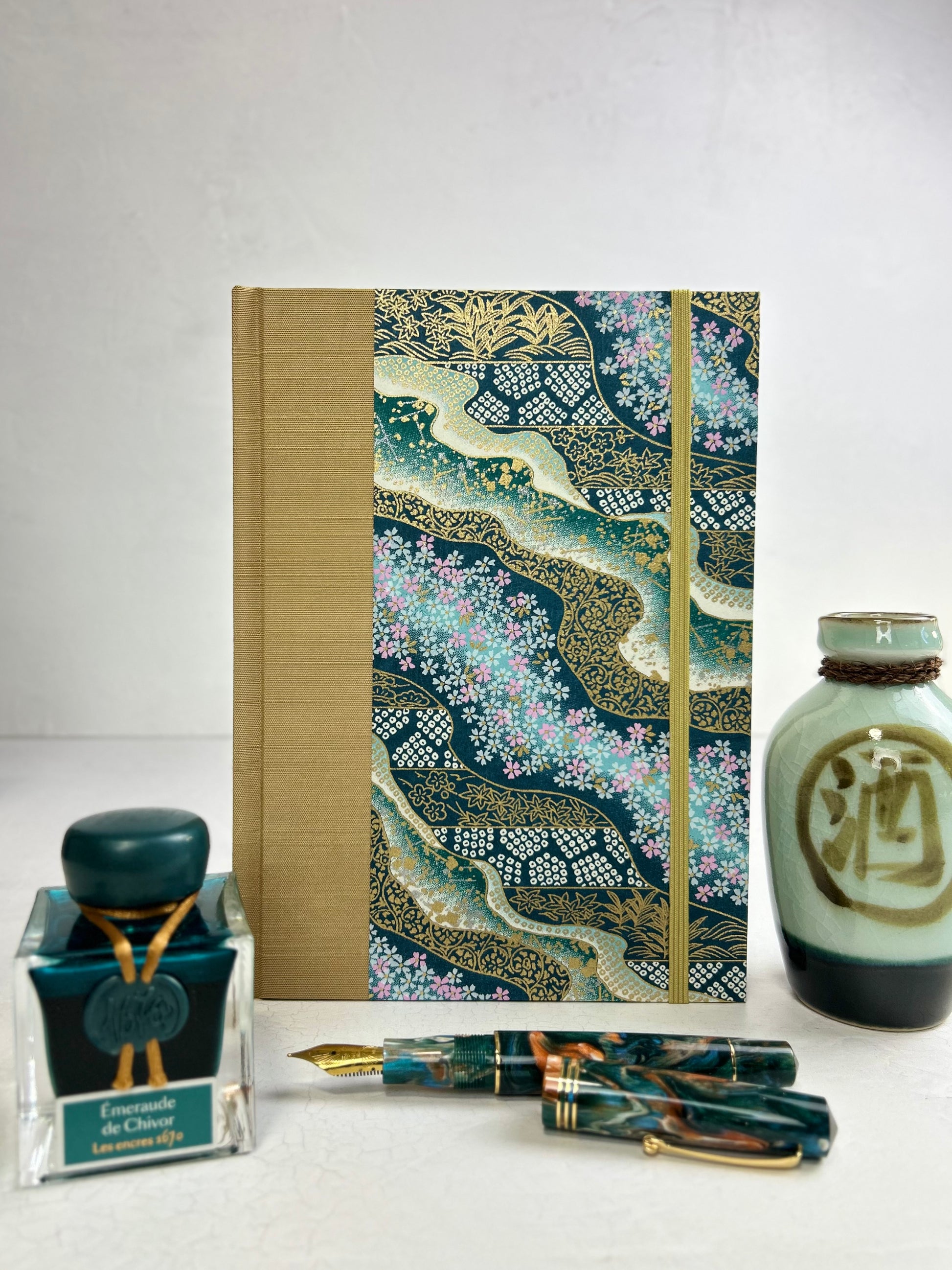Luxurious Japanese book cloth and silkscreened Japanese Chiyogami decorative paper, is used on the hardcover casing.