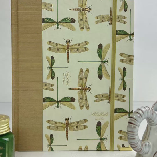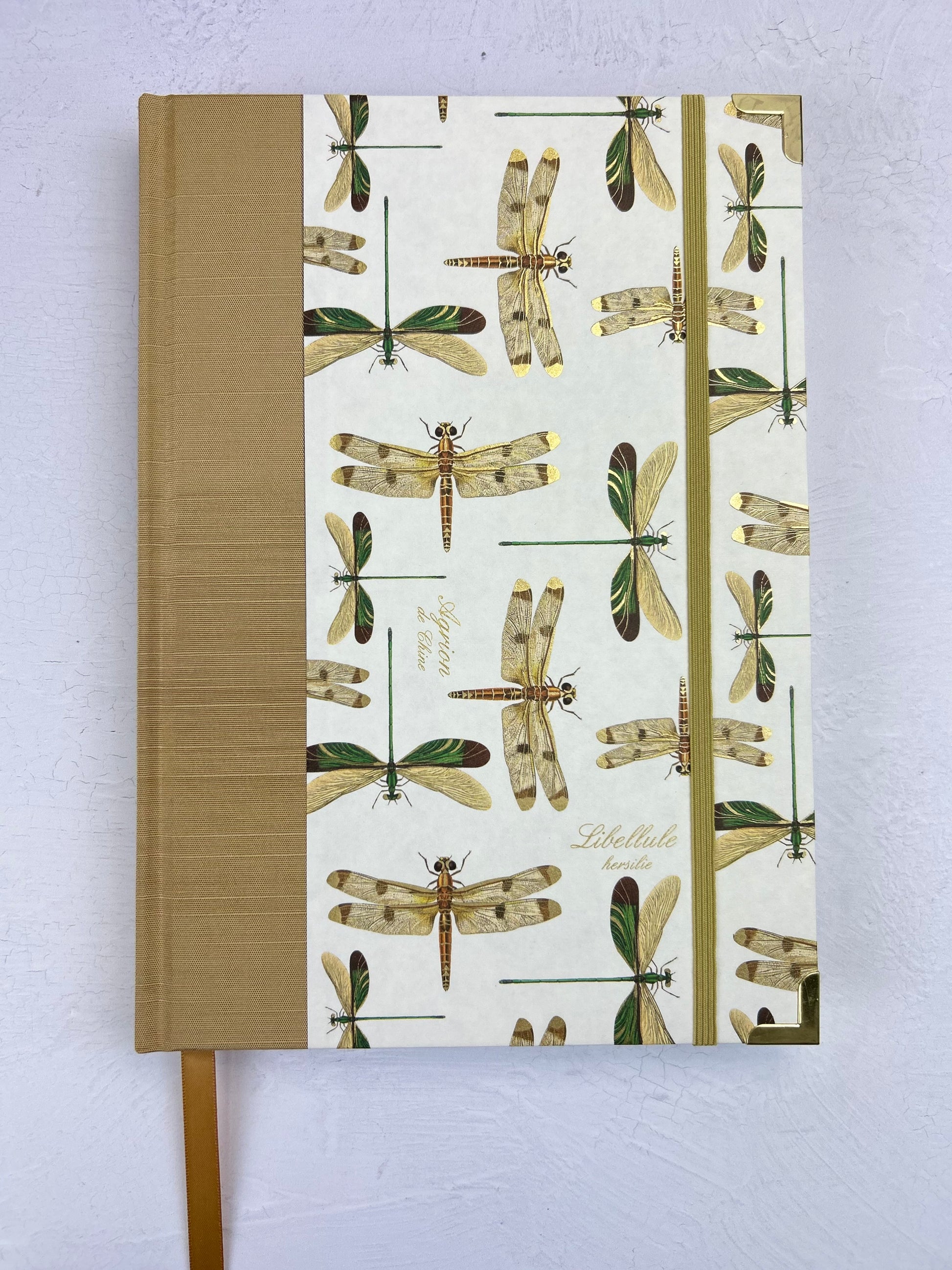 A5 160-page Hardcover Journal finished in Soft Gold Japanese book cloth and Dragonfly Florentine Italian Paper