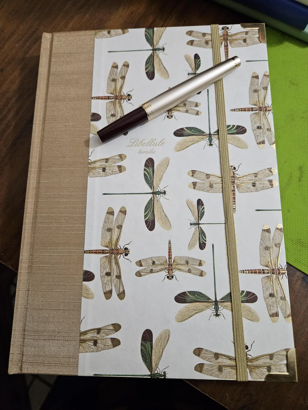 B5 192-page Hardcover Journal finished in Soft Gold Japanese book cloth and Dragonfly Florentine Italian Paper