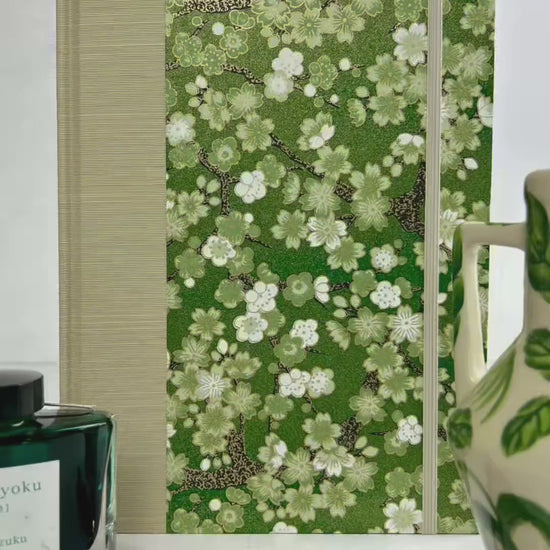 Luxurious Japanese book cloth and silkscreened Japanese Chiyogami decorative paper, is used on the hardcover casing.