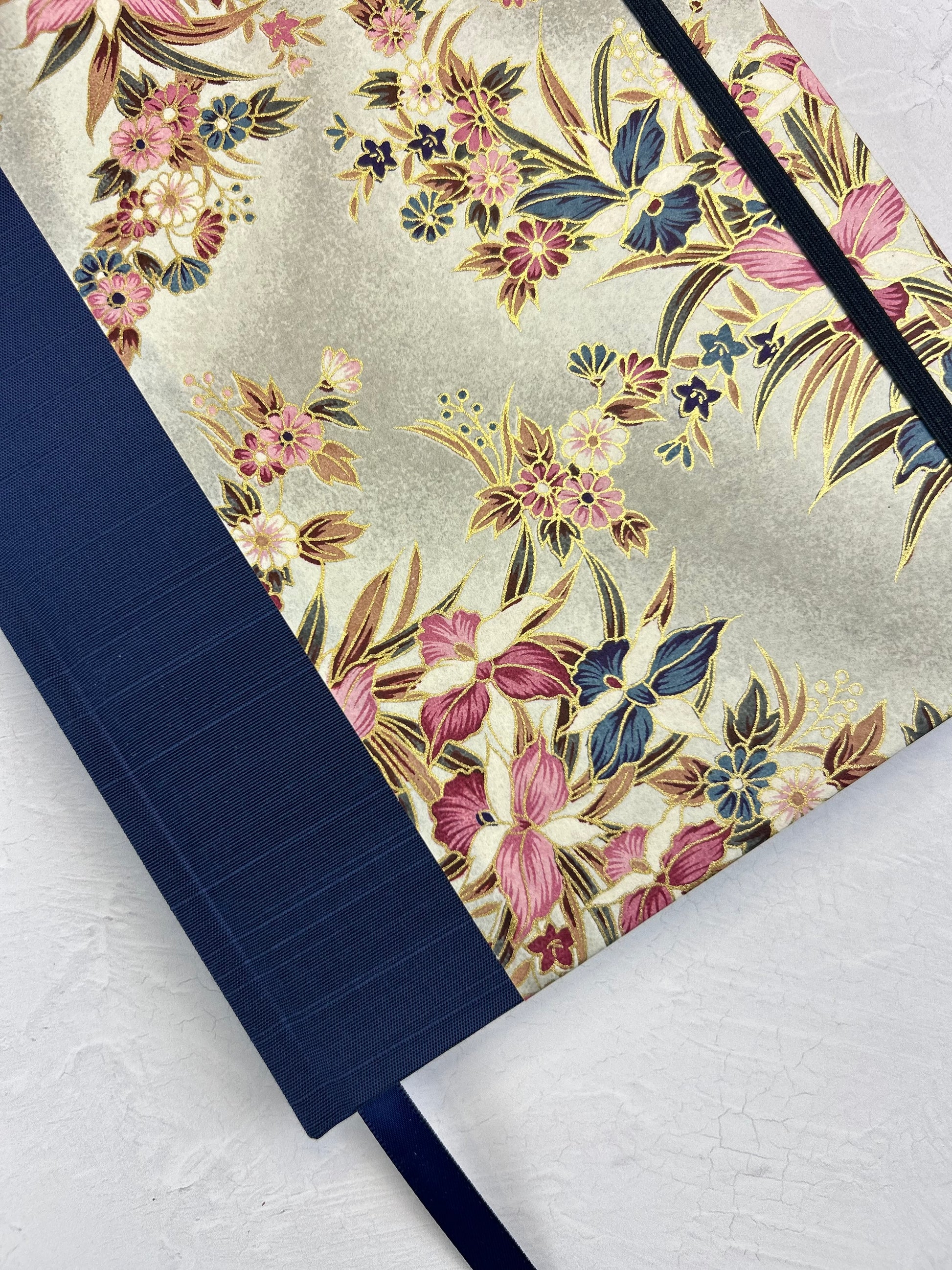 Luxurious Japanese book cloth combined with vintage silkscreened Japanese Chiyogami decorative paper, is used on the hardcover casing.
